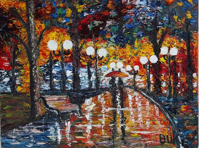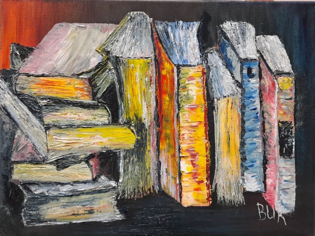Knížky, které máme v životě nejraději, jsou hodně osahané a někdy i s ohnutými rohy, právě díky tomu, že je čteme velice často a půjčujeme je svým opravdu dobrým známým. Já jsem si tento obrázek pojmenoval původně Oblíbené knížky, ale když ho uviděla moje učitelka malování, okamžitě jej nazvala Bordel v knihovně. A tak jsem si oba názvy spojil a bylo takzvaně vymalováno. Když jsem tento obraz ve velikosti nejméně 4x tak větší, než je tento, uviděl u mé dcery doma na stěně, ihned jsem se do něj zamiloval a řekl jsem si, že se pokusím toto téma také jednou namalovat. Jaké bylo ale moje překvapení, když jsem se dozvěděl, že i tento obraz, jako už se několikrát u mne stalo u obrazů, které jsem chtěl malovat, namaloval opět můj velice oblíbený, ruský malíř Aframov. Jeho technika malování špachtlí mě velice zaujala. Určitě jsem jej nechtěl kopírovat a vzhledem k mému spíš neumění, by to dost dobře ani nešlo. A tak je teď tady a já jsem s ním docela spokojen a vracím se k němu stejně často, jako ke svým oblíbeným knížkám.