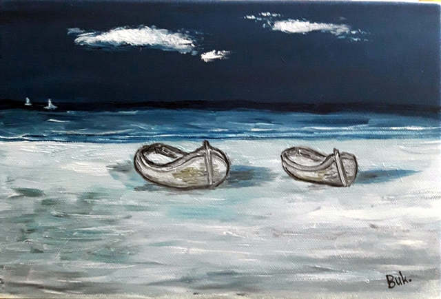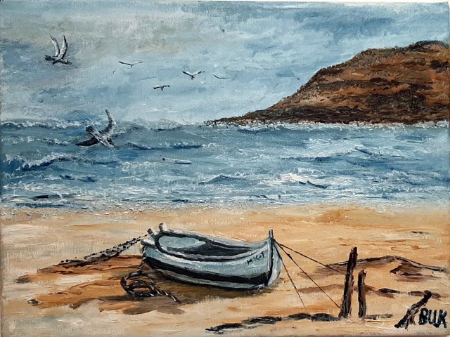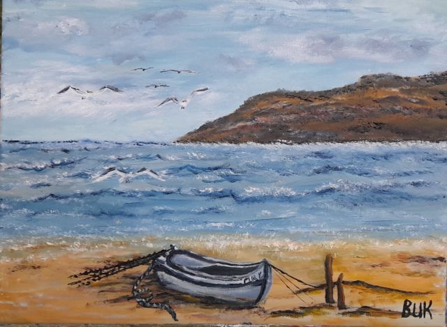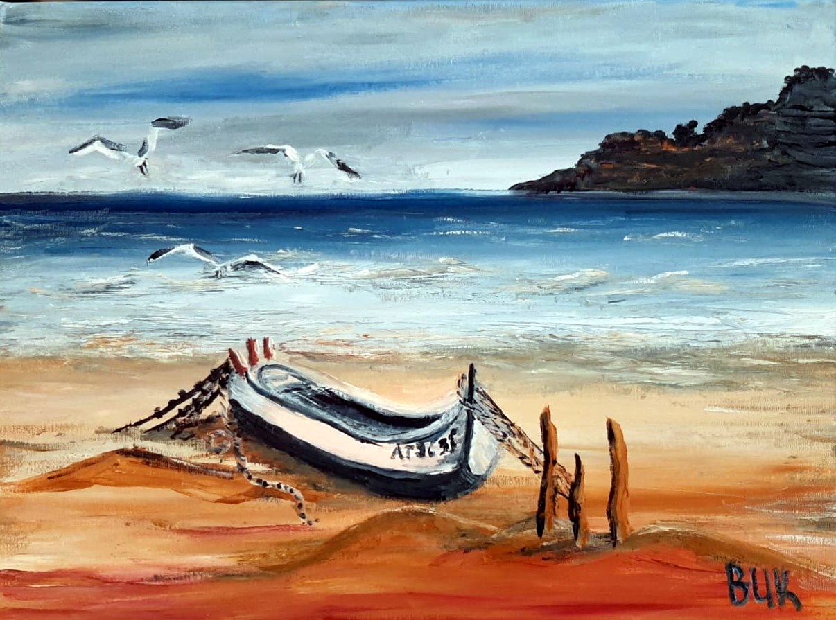 Obrázek opuštěného rybářského člunu na suchu s všude přítomnými racky jsme měli pověšený na stěně v penzionu Carlomar v uličce Kalle de Hierro v San Juan. Obrázky tam visely hned dva a oba mě učarovaly. Ale nemohl jsem se rozhodnout, který z nich je hezčí, tak jsem si z každého vzal kousek a namaloval jsem nakonec jakýsi hybrid těchto dvou obrázků. I tento obrázek jsem nakonec zanechal v San Juan k prodeji v obchůdku Giramondo, aby se má díla podívala zase trochu do světa.