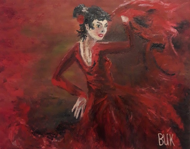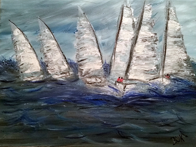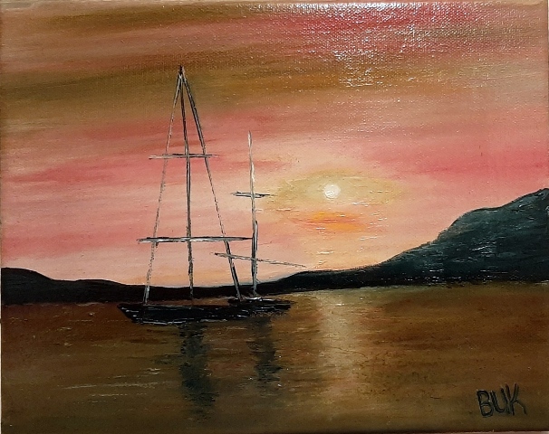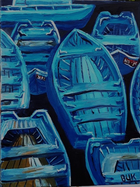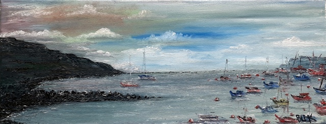 Předlohou mi byla část malby v restauraci na Tenerife, kde jsme naposledy byli před rokem, když jsme se s Bárou, mojí instruktorkou a Pepou jejím manželem, loučili s naším pobytem. Obraz malovala jako první naše známá Iva a od ní jsem si letos půjčil fotografii jejího obrazu a spolu s malbou na stěně, která mi hodně určovala. Okamžitě jsem věděl, co mám malovat, a tak jsem si v mysli vytvořil předlohu a obraz jsem namaloval. Na někoho může téma obrazu působit jako skrumáž lodiček při vlně tsunami, ale na mne působí velice uklidňujícím dojmem.