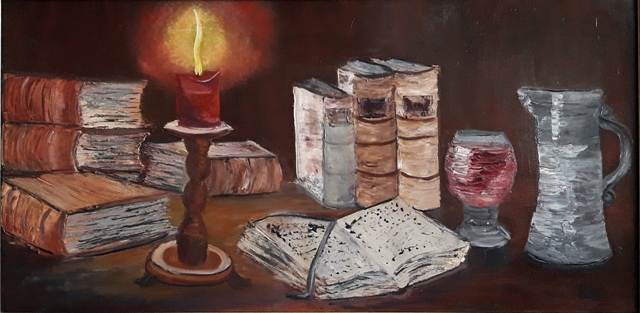 Druhý pokus malování Zátiší se svíčkou byl na objednávku. Zase každý obraz vypadá trochu jinak, ale každý má své do sebe. První zátiší, tedy obrázek číslo 13, má trochu jiné knihy, snad o něco větší svíčku, jinou sklenici s vínem i džbán. A přesto se mi zdají oba obrazy svým způsobem stejné. Cítím z nich klid a rozvahu, i když na druhém mi připadají stíny trochu skutečnější, a první obraz na mne působí trochu měkčeji, ale oba na mne působí nejspíš stejně vyrovnaně.