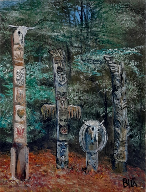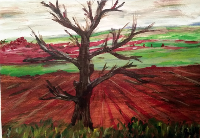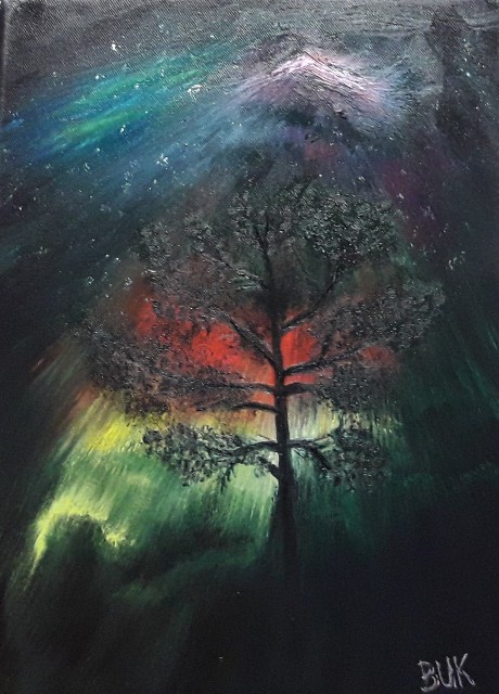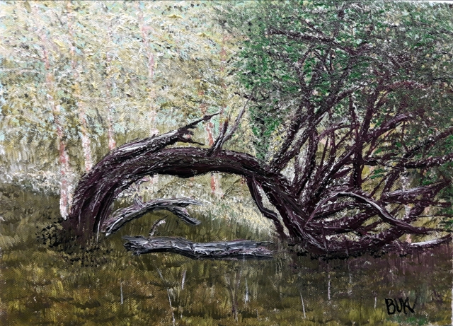 Tento strom jsem jednou objevil kousek nad naší osadou Bílé Skály na Kokořínsku mezi obcemi Tubož a Konrádov, když jsem zde s kamarádem Rosťou Jezvinou, tenkrát naším šerifem, hledal ve skále vytesanou skautskou lilii. Strom mě okouzlil svým tvarem, ač prohnutý jako luk, ale stále obrostlý bujarým listím. Po mnoha letech jsem se na toto místo zašel opět podívat a užasl jsem nad silou starého stromu a jeho vůli žít. Pravděpodobně do něj udeřil kdysi blesk, strom se rozštípl, ale s obrovským úsilím žije stále dál. Obrůstal nádherně zelenými listy a sem tam už i břečťanem, ale žil. Namaloval jsem si tento výjev a nakonec jsem tento obraz dal svému kamarádovi, který dnes žije v Austrálii, aby měl památku na překrásnou přírodu naší rodné české země.