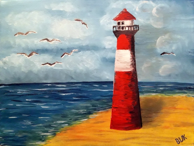 Je tomu už pět let, kdy jsme s babičkou byli spolu na školení první pomoci ve středisku In Garden ve Strašnicích v ulici Nad Primaskou. Tenkrát jsem uviděl v jedné ze suterénních učeben několik malířských stojanů a v nich plátna s rozmalovanými obrázky. ,,To bych si taky jednou chtěl zkusit, malovat olejovými barvami..." zasnil jsem se a vzpomněl jsem si na překrásnou vůni olejových barev, které si kdysi míchával můj tatínek doma u kuchyňského stolu, když maloval. Byl jsem tenkrát ještě hodně malé škvrně a tátovi jsem nesčetněkrát promíchal, tenkrát ještě dost drahé pigmenty s olejem, skleněnou tyčinkou ve skleničce se zabroušeným hrdlem s úmyslem pomoci mu, nebo jej aspoň napodobit. Nevím už, proč jsem tenkrát tak činil, ale většinou jsem za to byl bit. Ale ta kouzelná vůně olejových barev ve mně zůstala dodnes. Zkusit si ve stáří něco, co jsem nikdy moc neuměl, jsem tenkrát opravdu moc chtěl, a tak akční babička sehnala potřebné finance a k narozeninám jsem dostal od příbuzných krásné překvapení, kursovné na takzvané Malování s Bárou, kam chodím malovat dodnes. A právě můj první obraz byl tehdy olej na plátně, maják v rozbouřeném moři. Až o pár let později jsem tento obrázek použil jako ilustraci v jedné ze svých knížek k pohádce Maják na Bretani, a tak vlastně až dodatečně podle této pohádky vzniklo jméno tohoto obrázku Maják na Bretani.