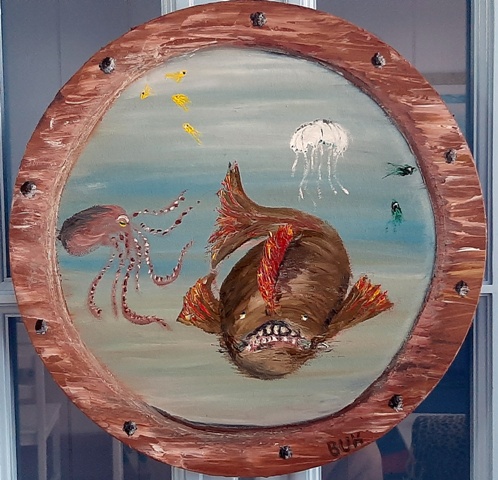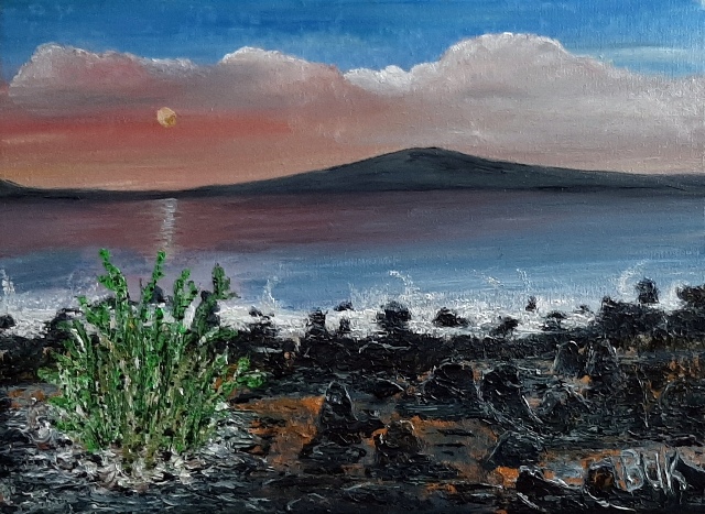 A dostávám se pomalu k obrázkům, které jsem namaloval na kursu malování na Tenerife v roce 2023. Obrázek velryby s racky na hřbetě jsem sice objevil na Bretani nad barem v restauraci u majáku v Lescoff u Ponte du Raz. Obraz neměl rám a byl pouze provázky přivázán na dřevěné tyči jako nějaký indiánský lapač snů, ale hned jsem si jej zamiloval a letos na Tenerife jsem se jej rozhodl namalovat. A jelikož jsme byli v San Juan, kde se tyčí k nebi na obzoru na kopci nad pláží skulptura obrovského velrybího ocasu, je na místě tento obrázek namalovat právě tady, na Tenerife. Olej na plátně velikosti 60 x 30 cm jsem namaloval nejprve s trochu menší velrybou, ale protože mi ještě dva racci chyběli, musela velryba kousek povyrůst, abych byl spokojen. Obraz jsem ponechal s ostatními čtyřmi obrazy, které jsem tam ještě namaloval, na prodej v malebném obchůdku s nevšední módou a turistickými suvenýry Giramondo, který je přímo naproti přístavu v San Juan.