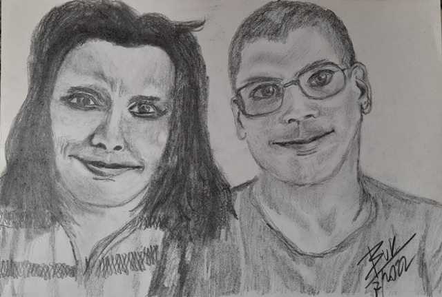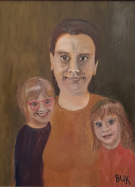 Jako předlohu jsem měl pouze čtyři fotografie. Fotografii maminky a zvlášť fotky dvou děvčátek a ještě jednu malou rozmazanou fotku v telefonu, na které bylo někde na hřišti jedno z děvčátek v brýlích. Vše jsem si musel nejprve poměrově upravit, a pak vystříhat jednotlivé postavy a opět slepit. Svítivě růžové brýle jsem si na předloze domaloval fixem. Obrázek jsem pak maloval olejem na plátně velikosti 40 x 30 cm. Obrázek jsem maloval jako dárek pro svou skoro snachu. Zkrátka dostal jsem zadání a pokusil se jej realizovat. Snad se mi to povedlo...