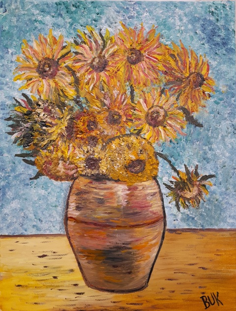 Obrázek Vincentovy slunečnice jsem namaloval podle předlohy slavného obrazu Slunečnice od Vincenta Van Gogha. Chtěl jsem jenom zkusit použít podobnou techniku, jakou vždycky malovával pan Vincent Van Gogh, kterého jako malíře jsem vždycky velice uznával . Jestli se mi to aspoň trošku povedlo, to neumím posoudit, ale rozhodně mě to hodně bavilo a měl jsem při malování nádherný pocit.