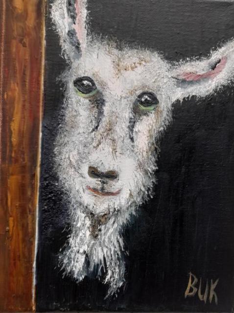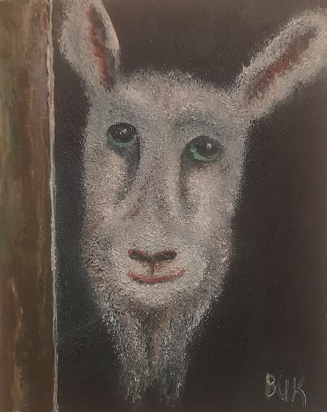 Chodím malovat k Báře do ateliéru ve Vysočanech do ulice U Vysočanského pivovaru kousek od Rokytky. Barunka, moje instruktorka olejové malby, si doma namalovala větší obraz kozy vykukující za trámem z přítmí kozího chlívku. Z obrazu přímo až čiší závan kozího mléka, které jsem jako kluk chodíval kupovat do bandičky na statek k Chadimovým. Jakmile jsme na malování Bářinu kozu uviděli, každý jsme si ji chtěli namalovat také a založili jsme tkzv. Kozí klub. Jedno z hlavních pravidel pro členy klubu je povinnost vyvěsit si svou kozu na takovém místě v bytě, aby byla každému co nejvíc na očích. Obrázek máme proto pověšený (každý tu svou kozu) na toaletě. My jej máme pevně přidělaný zevnitř na dveřích. Našemu vnukovi se sice nelíbí, že koza na něj čumí i v choulostivých situacích, ale čumí svýma až moc ,,lidskýma" očima na každého a ještě nikomu nic o nikom opravdu neřekla. A nemrká. Ale to je povídání k té mé první kozičce. A ta druhá? Ke mně, se vám jednou takhle večer u kontejnerů, kam jsem vynášel domácí smíšený odpad, přiblížila paní v tmavší mikině s kapucí, ani jsem neviděl, o koho se jedná. A požádala mi, zda bych jí nenamaloval kozičku, kterou před časem viděla na mé výstavě v klubu Point 50+. Zkrátka jsem jí to slíbil a splnil slib. To je vše, nic víc. nic méně.