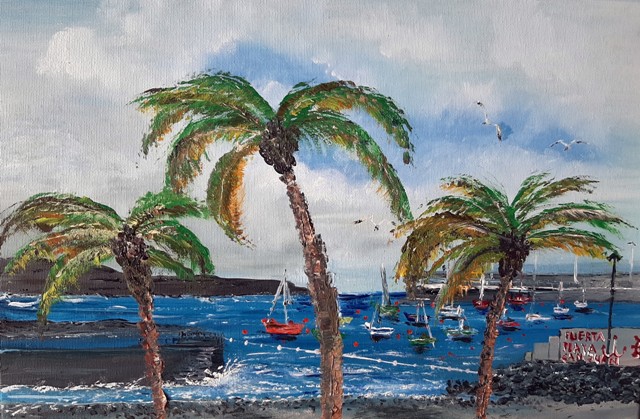 Tento přístav miluju. Už jsem jej maloval nejméně třikrát. Tento poslední, při letošním (r. 2025) kurzu malování na Tenerife, ještě čerstvě namalovaný, s ne zcela zaschlými barvami, jsem jej prodal v obchůdku U Giramonda, kde jsme měli letos vernisáž. Nový majitel se svou partnerkou měli opravdu velikou radost, když si opatrně odnášeli ještě mokrý obrázek domů z dovolené. Snad jim bude ještě dlouho připomínat pěkné chvíle společně strávené na břehu klidného moře, v přístavu Porto San Juan v městečku Playa de Isora na Tenerife.
