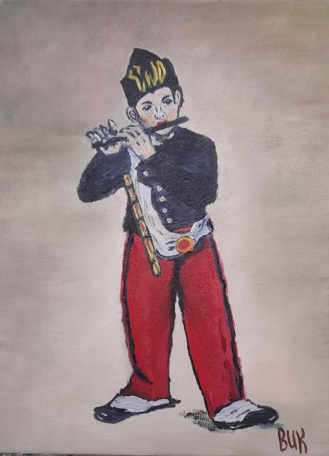 Sicilské městečko kousek pod Etnou, to je Riposto. Z jedné strany krásné, na druhou stranu omšelé a pusté. Jako kdyby tam doteď byl socialismus, jako tomu bývalo kdysi u nás, a najednou skončil a staré vybydlené a využité městečko se z ničeho nic probudilo do nové éry. Čtvrť ve které jsme na jednom z našich letních pobytů byli, byla úplně stejně vybydlená a zároveň luxusní, jako samo Riposto. Ubytováni jsme byli v krásné vile s výtahem. Náš byt se dvěma balkony nám z jedné strany umožnil výhled na stále čoudící Etnu a z druhé strany na děravé střechy a neuspořádané terasy chudších stavení, než jsme my obývali a až někde hodně v dálce prosvítalo moře. Majitelka naší vily byla malířka a nemohl jsem si nevyfotit obrázek chlapce s flétnou, kterého měla na stěně obýváku, pověšeného hned naproti dvěma barenvým vypáleným hliněným hlavám postaveným na staré těžké dubové komodě. A proč pištec? Za prvé se mi toto slovo velice hodí k názvu města Riposta a z druhé v Taormině, kde jsme také byli jednou na výletě, jsem podobného chlapíka v kroji viděl a dokonce slyšel hrát na malou píšťalku před hospodou, ještě s kamarádem s kytarou a při tom poskakoval zběsile mezi nadšenými hosty, popíjejícími červené víno u svých stolečků. Léto, Sicílie, krása... Až skoro o celý rok později, jsem se na výstavě v Pointu50+ na Zahradním městě od jedné z návštěvnic dozvěděl, že tento obraz byl určitě malován podle původního obrazu vytvořeného panem Édouardem Manetem v roce 1886. Jaká je to přenádherná souvislost. A považte, obraz se již původně jmenoval Pištec...