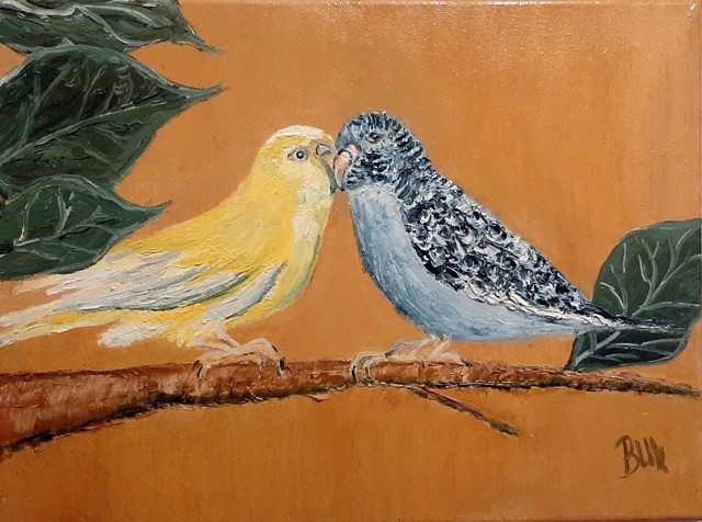 Obrázek Papoušci pro Ježibabu jsem namaloval pro jednoho dobrého kamaráda z mé dřívější práce, kterému jsme říkali Ježibaba. Je jí totiž dost podobný, ale jinak je to moc hodný kluk. Mám ho rád a vždycky jsme si hezky popovídali o muzice, ale také o papoušcích, protože je celý život choval, učil je mluvit a ptáčci ho vyloženě milovali. Většinou měl páreček, ,,aby si taky pořádně užili života," jak často sám říkával. Poslední dobou jsme se spolu viděli vždycky jen tak jedenkrát za rok na srazu důchodců a bohužel, než jsem mu stačil obrázek namalovat, jedna z jeho andulek, ta žlutá, mu umřela v ruce, doma, přesně na Silvestra v roce 2023. Snad mu jí obrázek bude aspoň trošku připomínat. Jen škoda, že nevím, jestli mají andulky umělecké cítění, nebo jestli ,,Pepíčkovi", tak se většinou samečci od andulek jmenují, můj obrázek bude jeho lásku připomínat.