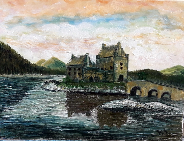 Skotský hrad, stojící na malém ostrůvku na jezeře Loch Duich v západní části Highlands - Skotské