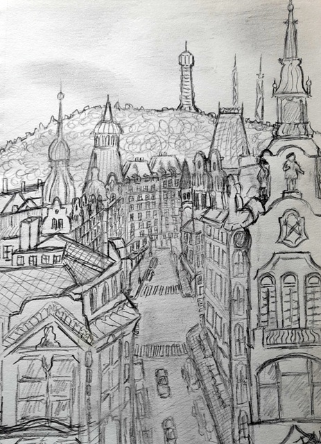 Tento obrázek pro mne byl něčím novým. Maloval jsem jej na střeše jednoho domu na Starém městě, přímo nad restaurací V Kolkovně. Byl to velice zvláštní pocit. Ne, nevisel jsem uvázán na komíně, ale normálně jsem seděl v pohodlném křesílku na balkoně u jedné své kamarádky. Ale tak jako tak nemám rád výšky. Obrázek je malován tužkou na čtvrtce ve skicáku. Snažil jsem se vystihnout všechny detaily, ale jak a zda se mi to vůbec podařilo, to nechť posoudí druzí.