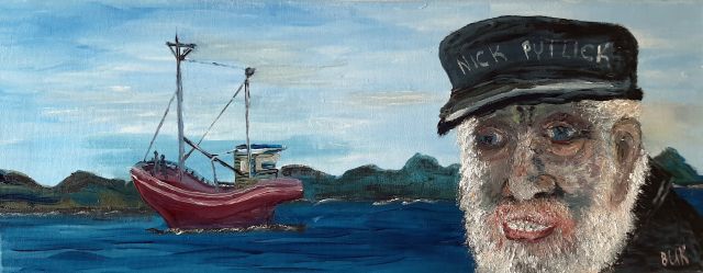 Na řeckém ostrově Sámos, kde jsme před časem trávili jednu z našich dovolených s vnoučaty, stála kousek za městem Nickova rybí restaurace. Freska se starým řeckým rybářem v námořnické čapce, namalovaná přes celou jednu zeď staré restaurace, doplňovala modré vybavení, tedy stoly, židle a sedátka udělaná ze starých, modro-bíle pruhovaných sudů, a několik starých vysloužilých lodních světel, pověšených ze stropu a houpajících se na tlustých lodních lanech. Vše krásně doplněné směsicí vůní moře, pečených ryb a rozlévaného červeného vína. Ofotil jsem si tento motiv, který se přímo vybízel k tomu, abych si jej jednou namaloval. A když jsme rok na to zase byli malovat na Tenerife, seděl jsem u šumícího moře, nasávaje slaný mořský vzduch, zavzpomínal jsem si na kamaráda Pytlíka. Sice nebyl nikdy námořníkem a možná, že by se i jako já bál delších plaveb na lodích, ale starý námořník Nick, vyobrazený na loupající se fresce ze staré rybí restaurace na Sámosu, mi ho dost připomínal. Namaloval jsem si tedy Pytlíka s lodí a na čepici jsem mu napsal, podle vzoru z nápisu na námořnické čapce starého řeckého rybáře, Nick Pytlick. Často si na tebe vzpomenu, kamaráde…