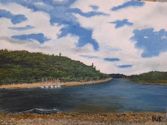 Kamarádka Verča mi požádala, zda bych jí nenamaloval Orlík v létě. Jako předlohu mi poskytla několik fotografií s detaily zakroužkovanými zvýrazňovačem. Mojí snahou bylo podchytit na obrázku nejen letní náladu, ale také pár detailů které má kamarádka požadovala dodržet Jestli se mi to povedlo, ví jen ona. Poslední dobou jsem viděl na webu stejnou krajinu, ale skoro bez vody. Situace v přírodě je nyní zoufalá, snad se to po zimně zase trochu zlepší. Světu bych to moc přál. Nebylo by dobré jednou malovat už jen to, co si malíř představuje, jak kdysi krásně svět vypadal.